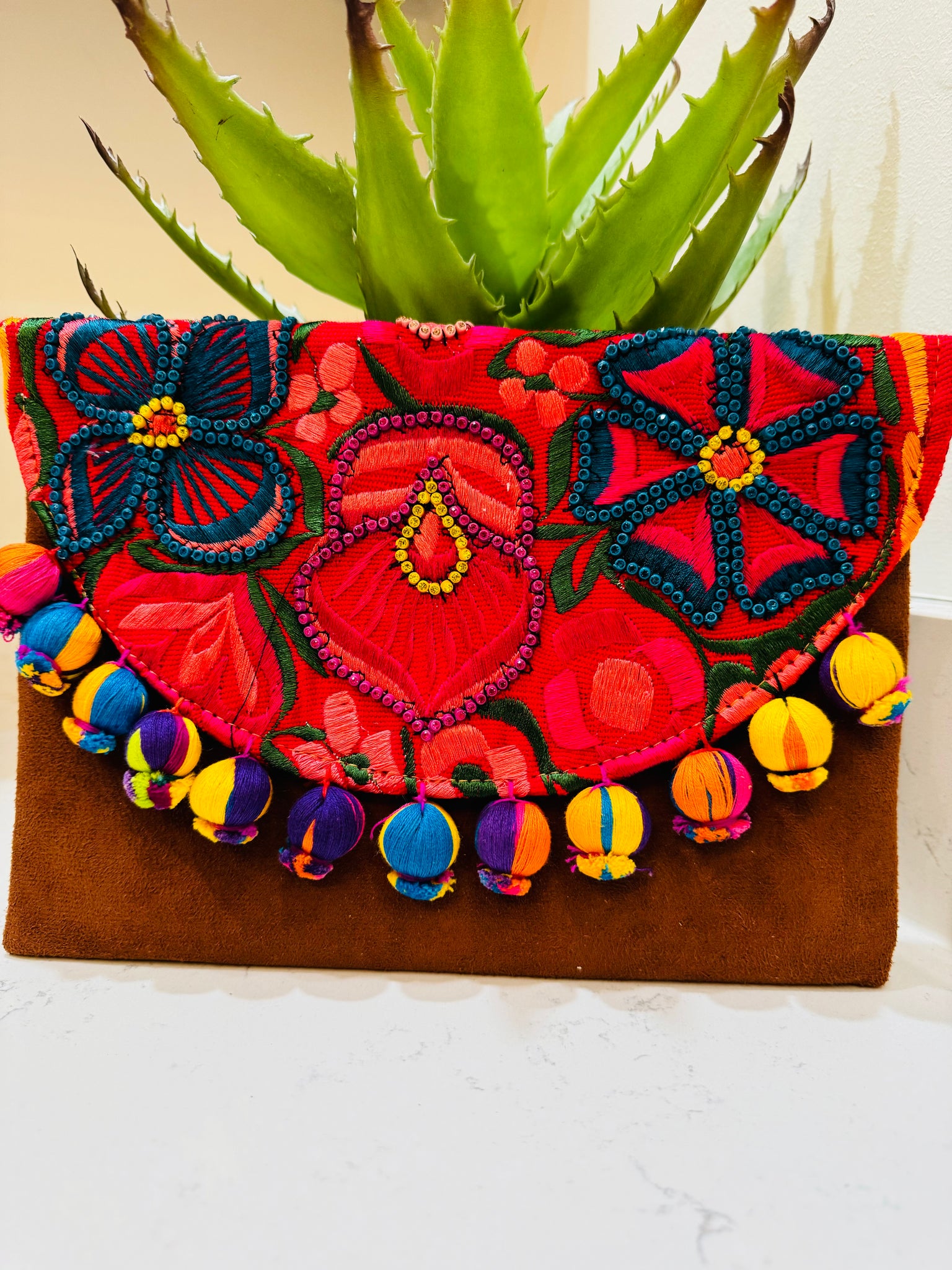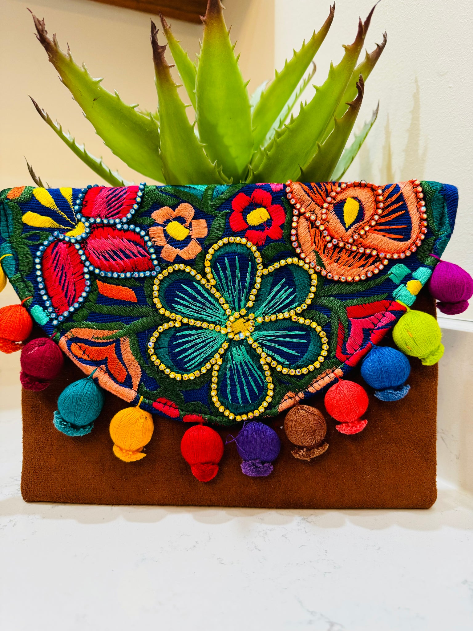 This one of a kind envelope clutch is a suede handmade bag featuring embroidered and a vibrant floral design.